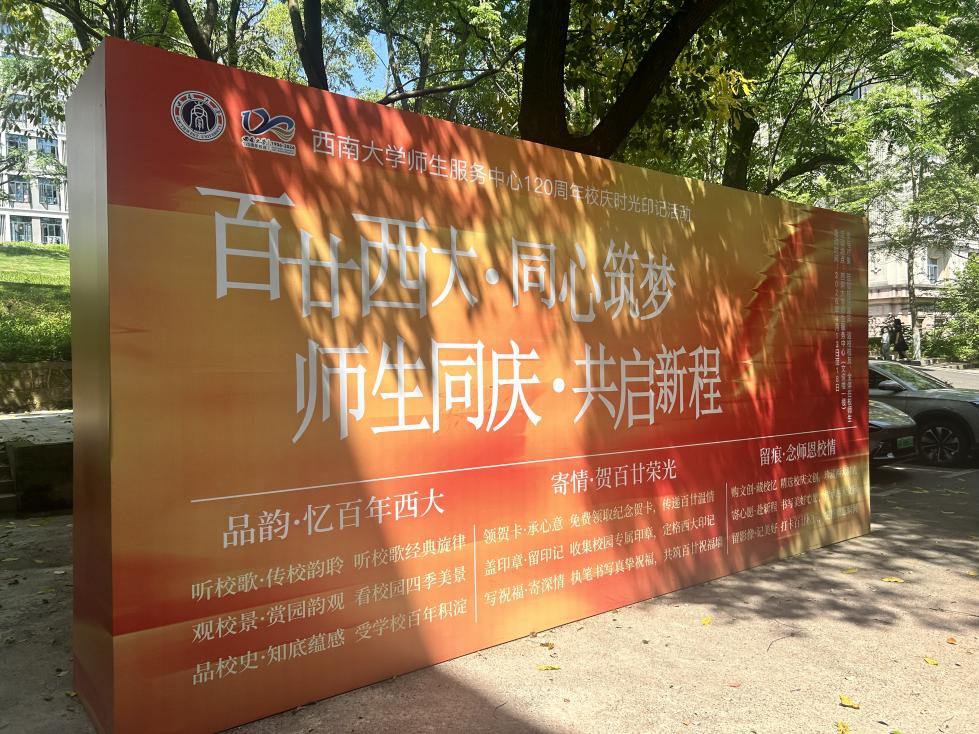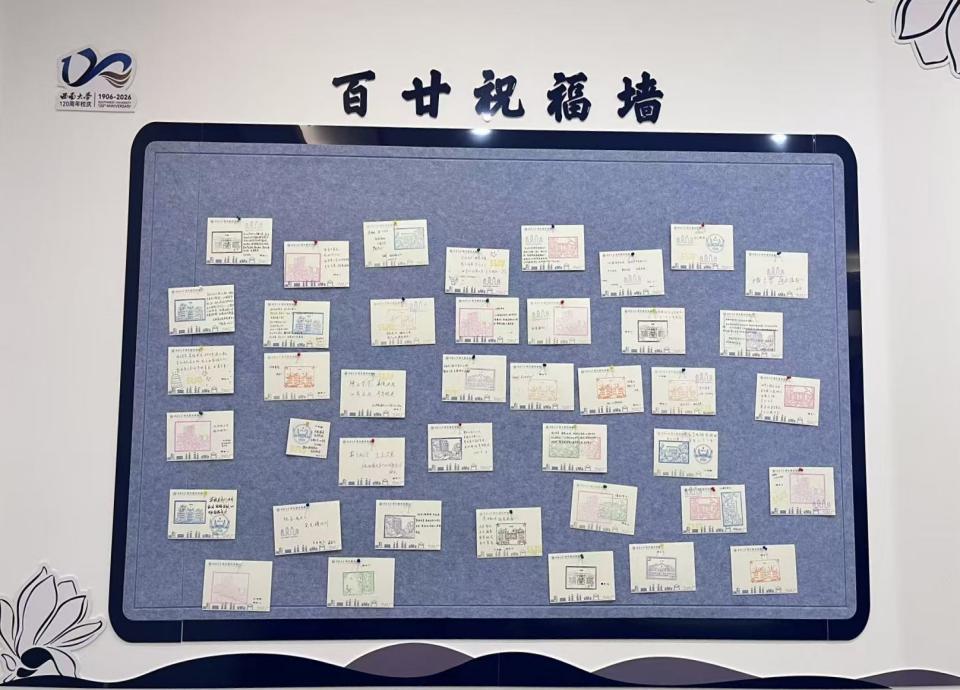 在视频前聆听校歌、观摩校景、品味校史;手持纪念卡片,拓上精巧的校园专属印章,定格着西大印记,将百廿校情向远方流转。在百廿祝福墙上,校友们执笔写下对母校的真挚祝愿,“祝西大生日快乐”“愿母校再谱华章”……,一句句寄语汇聚成满墙的温情,传递着对学校的深情眷恋。